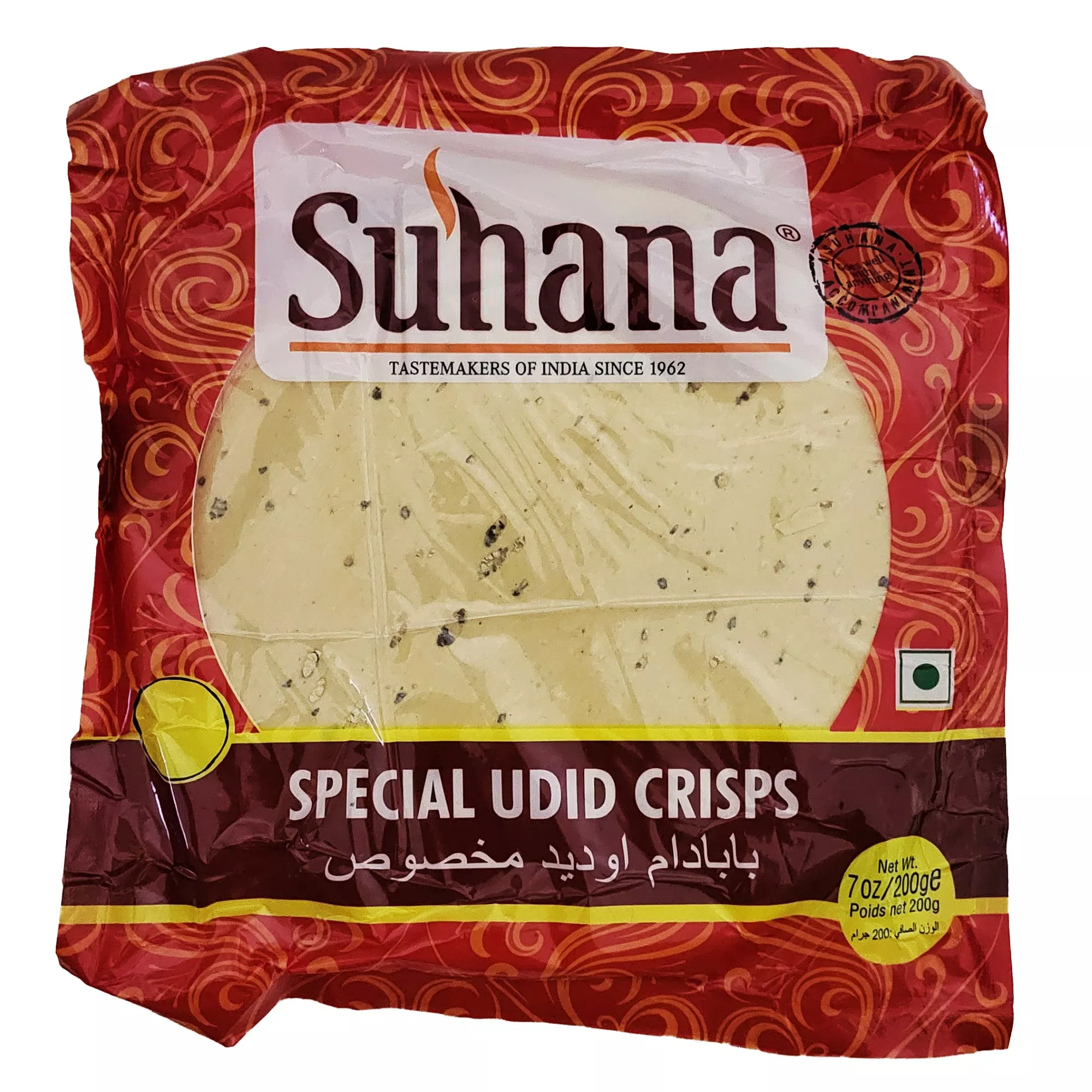 Suhana Plain Udid Papadam — це тонкі хрусткі коржі, виготовлені з борошна чорної сочевиці (виддал). Ці пападами часто подають як закуску або гарнір до основних страв в індійській кухні, додаючи текстуру та ніжний смак до різних традиційних страв.